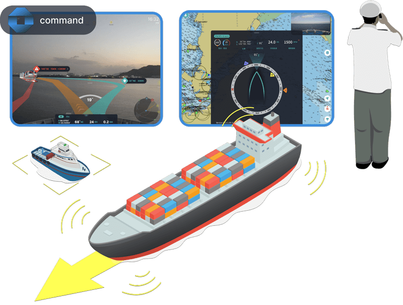 JRCSは、独自のコンピュータビジョン技術を用いた製品「infoceanus command」を商船三井の船舶に搭載し、現在の航海計器では検出できない目標物も含めて認識する技術力と、航行中の船舶運航支援に有効であることを確認しました。夜間や視界の悪い環境、特に船員にとってストレスとなる状況下で、他船の位置や進行方向、相対速度、自船との距離などを推定し、最終的には自律航行中にそのような対象物を認識することを目的として、効果的に動作することが確認されています。